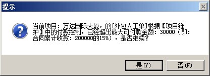 3. 超控制金額付款預警提示。在新建、審核付款申請單操作時,如果付款申請金額超過還可付款金額,都會彈出相應提示。我們以外包人工單為例,上圖所示還可付款金額為20000,我們做一張付款申請單,如果我們付款金額為30000,那么在單據保存和單據審核時,都會彈出以下的提示: