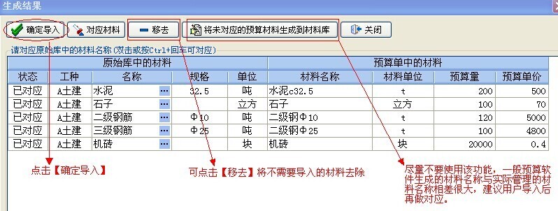 導(dǎo)入完的生成結(jié)果,(由于預(yù)算軟件中生成的材料分析表里的材料名稱與實(shí)際發(fā)生的材料名稱有些差異,這里需要用戶將未對(duì)應(yīng)的材料做下手工匹配)