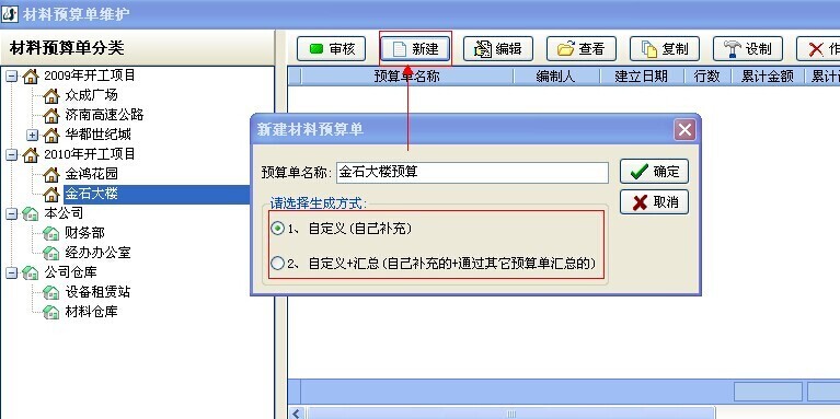 1. 打開(kāi)【材料管理】模塊中【材料預(yù)算單】,選中項(xiàng)目后點(diǎn)擊【新建】按鈕創(chuàng)建材料預(yù)算單。