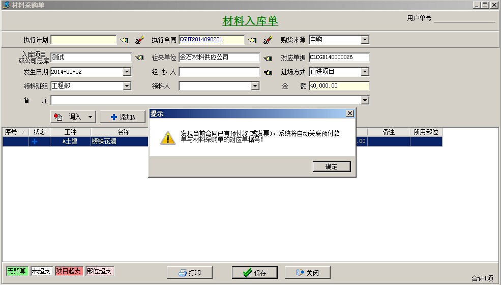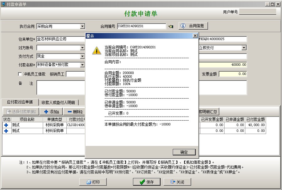 彈出付款申請單,付款名稱自動默認材料設(shè)備款+預付款,付款明細是自動帶入的,選擇支付方式點保存,會出現(xiàn)提示窗口根據(jù)下面截圖進行選擇繼續(xù)。