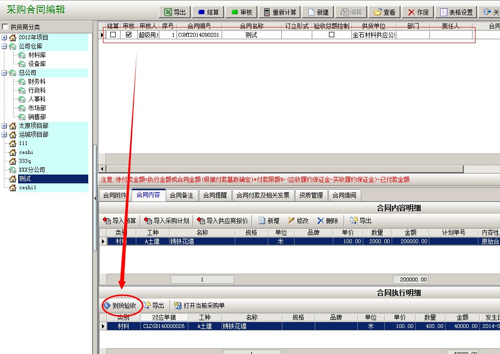 打開采購合同內(nèi)容,點擊合同執(zhí)行明細的[到貨驗收]