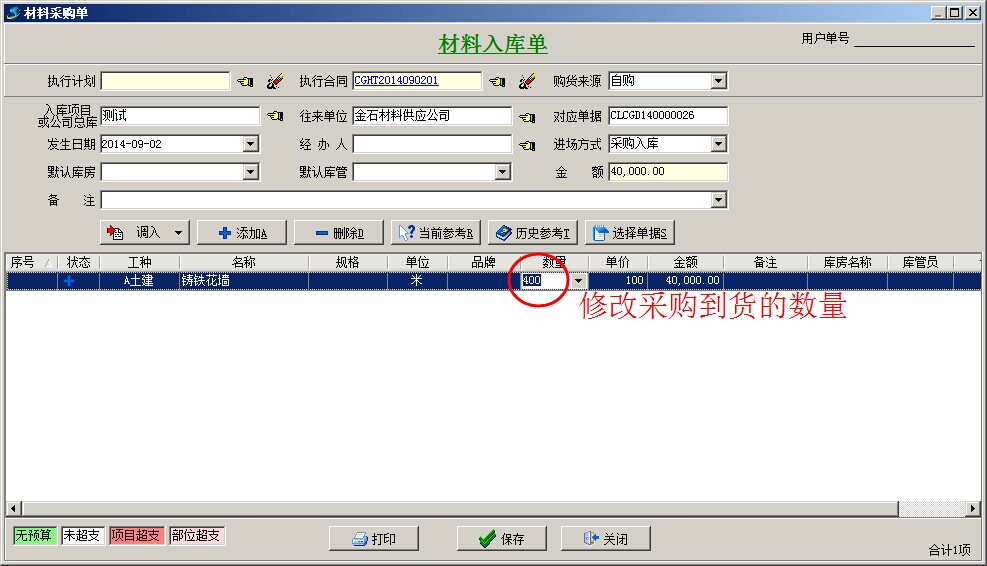 在彈出的材料入庫單明細中,修改驗收數(shù)量