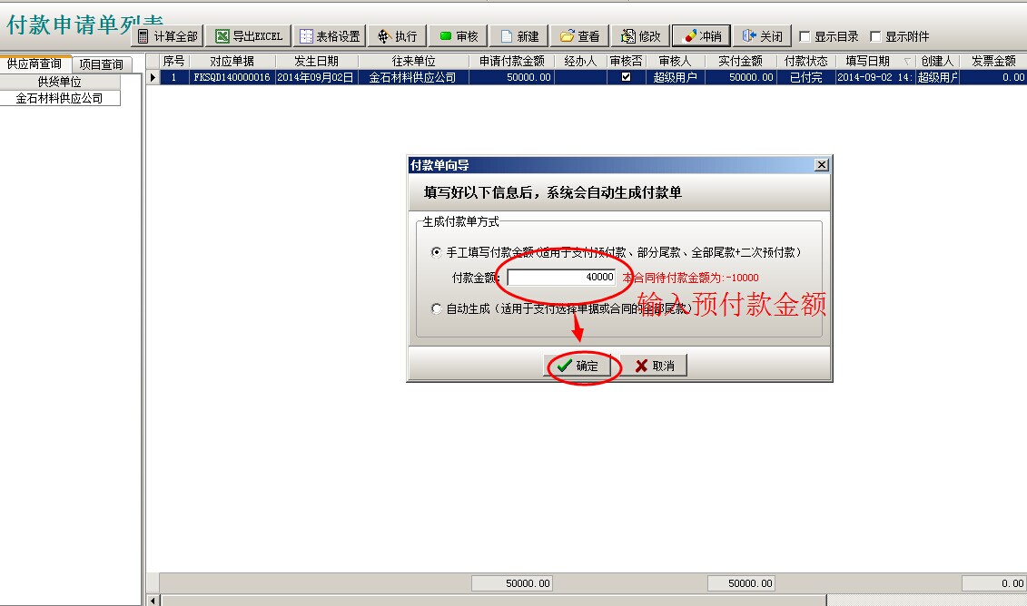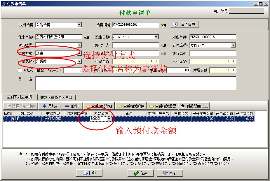 注:因為沒有到貨驗收入庫,所有付款名稱要為:“定貨款”、“訂貨款”、“預支款”、“預付款”,并且要對應好合同編號(系統(tǒng)規(guī)定必須有合同才能做預付款或定金等付款)。