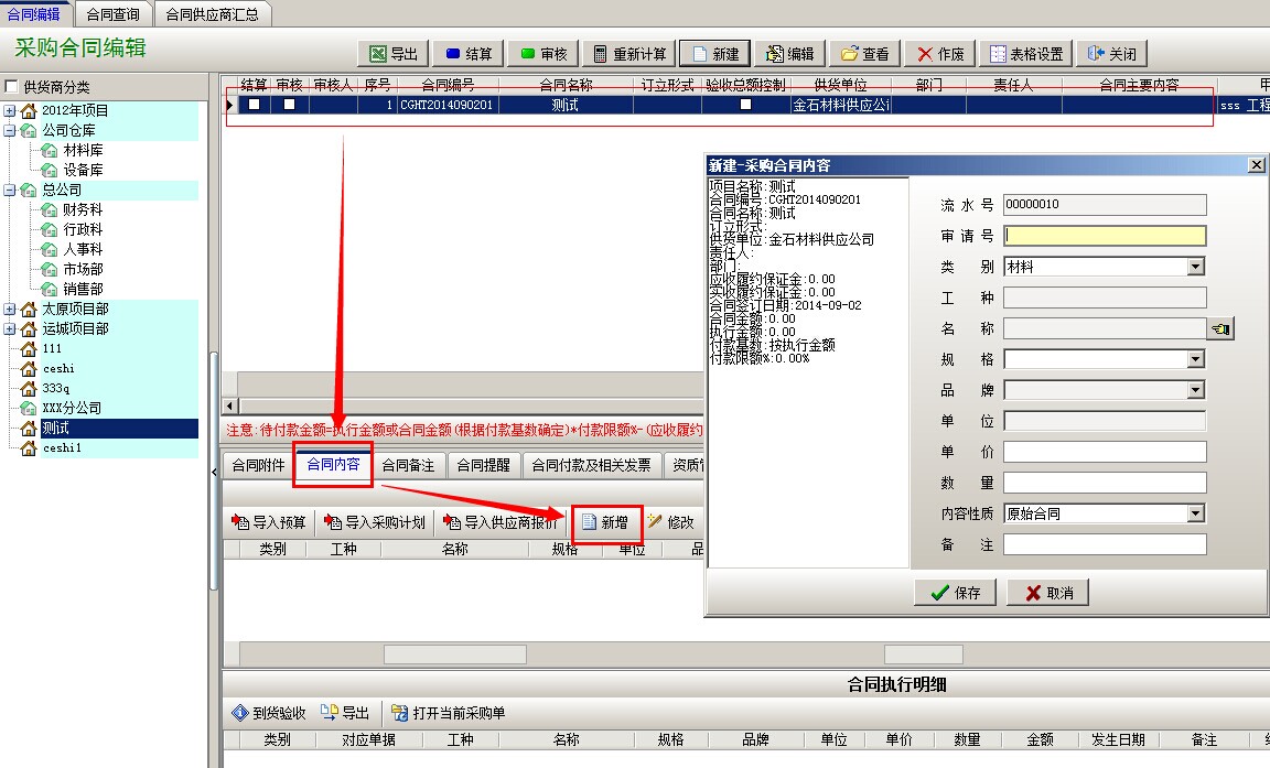 打開采購合同,左側(cè)選擇相應的項目,右邊點新建,錄入采購合同相關(guān)信息,保存。