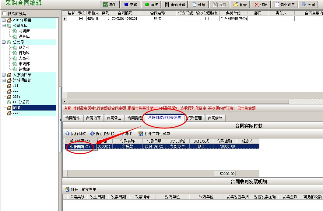 然后打開合同付款及相應發(fā)票,點執(zhí)行付款,選擇第二項根據(jù)向?qū)?/strong>。
