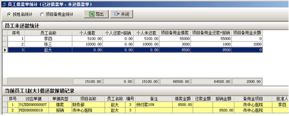 請(qǐng)款審核完成后,接下來(lái)是財(cái)務(wù)人員把錢(qián)支付給請(qǐng)款人然后執(zhí)行【員工請(qǐng)款單】生成【員工借款單】。下圖所示:生成【員工借款單】后在員工借款單統(tǒng)計(jì)中可以看到,目前借款人趙大,項(xiàng)目備用金借款為8500元。