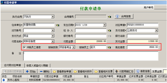 入庫(kù)單創(chuàng)建完并審核后,發(fā)起付款申請(qǐng)單,在下圖付款申請(qǐng)單中,選擇好沖抵員工借款、報(bào)銷(xiāo)類(lèi)別、報(bào)銷(xiāo)員工,這時(shí)會(huì)根據(jù)單據(jù)付款金額與抵扣金額,自動(dòng)計(jì)算出實(shí)付金額,而實(shí)付金額是我們要付款的金額,這時(shí)可以在后面的收款人或墊付人明細(xì)中選擇向誰(shuí)付款,如果是員工墊付的就填寫(xiě)員工,如果是付款給往來(lái)單位就可以空著不填。