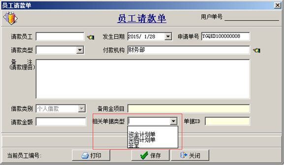 這時(shí)的【員工請(qǐng)款單】較為簡(jiǎn)單,只提供了備注、與附件功能,給審核該單據(jù)的管理人員造成了一定的難度。為了解決這一問(wèn)題軟件改進(jìn)了【員工請(qǐng)款單】給請(qǐng)款單中增加了三個(gè)來(lái)源:【資金計(jì)劃單】、【采購(gòu)計(jì)劃單】、【簽呈】,以方便在員工請(qǐng)款審核中,查看請(qǐng)款理由是否合理。其中【采購(gòu)計(jì)劃單】和【簽呈】是軟件中一直存在的模塊,直接關(guān)聯(lián)的計(jì)劃單號(hào)和簽呈單ID。