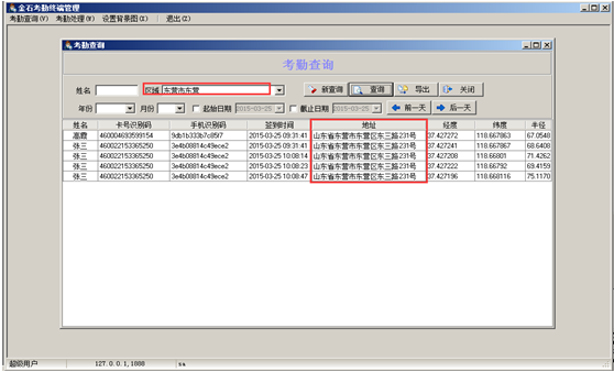手機簽到成功之后,在服務器端登錄系統之后,有查看權限的人可以進入“手機考勤管理終端”查看員工的簽到信息并進行管理。如需查看考勤信息可點擊“考勤查詢”的按鈕,可按照“姓名”進行查詢,或者輸入被授權的“地區名稱”進行查詢,輸入“姓名”查詢到的是對應的員工的簽到信息,輸入地區名稱查詢到的是在對應地區內簽到的所有員工的查詢信息,如圖: