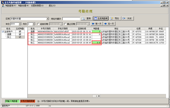 輸入“區域名稱”或者“關鍵字”,點擊“查詢”按鈕可查詢考勤信息,“卡號識別碼”是手機卡號的唯一識別碼,當“卡號識別碼”顯示異常時可檢查是否存在作弊行為,系統自動定位用戶的簽到地址,若簽到信息正常可根據簽到時間在“考勤值”輸入框中輸入對應的考勤值(若同一用戶一天內多次考勤只在最后一次輸入考勤值),如圖: