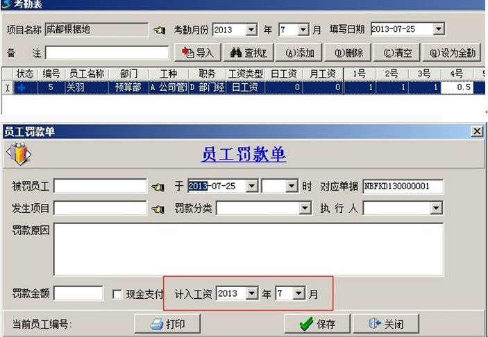 1. 【員工工資】可用于統(tǒng)計公司管理人員、項目管理人員等固定工作人員的工資成本。員工工資表是根據(jù)員工考勤表生成,每個項目的考勤可以單獨錄入,但一個月份只能生成一張工資表。員工考勤的錄入比較簡單,是按數(shù)字表示出勤情況的,全勤填寫1、半勤填0.5、缺勤填0。如果有遲到、早退、曠工等情況可以填寫員工罰款單來進行扣工資。
