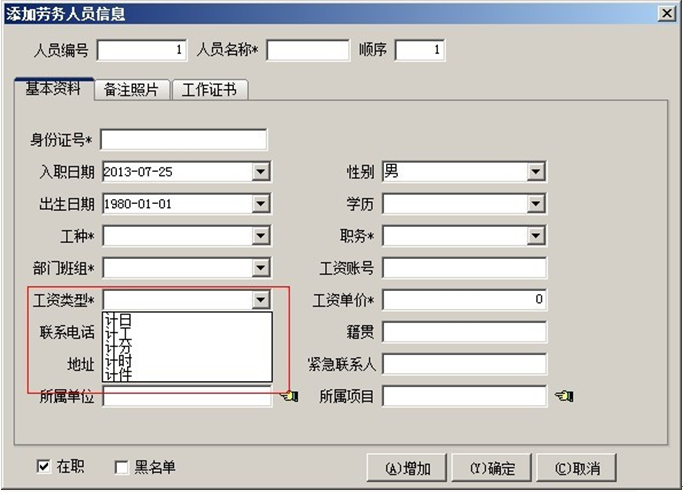 2. 【勞務工資】可用于統(tǒng)計公司非固定的工作人員,或其他勞務公司的工人工資,勞務工資計算方式可選計日、記工、計分、計時、計件(在添加勞務人員信息時設置)。