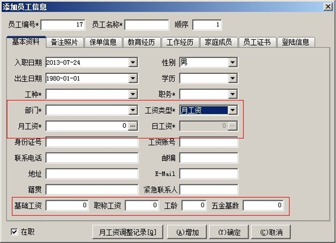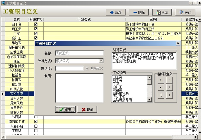 員工工資的計算方式有月工資和日工資兩種方式(在員工維護中設置),按月工資計算時工資不受考勤影響,按日工資計算時,員工工資等于日工資乘以考勤天數(shù)。以上計算得出的是應發(fā)工資,用戶還要根據(jù)自己的實際情況來編輯公式,得出實發(fā)工資。下圖所示:員工維護中有每個員工固定的月工資、日工資、基礎(chǔ)工資、職稱工資等。