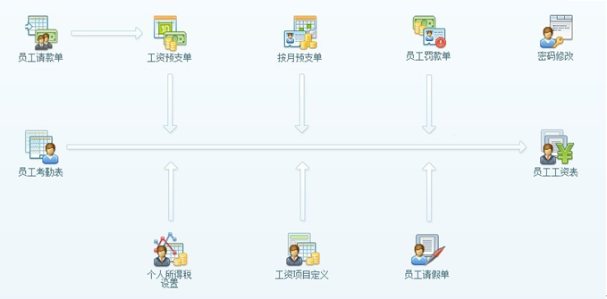 除此之外,還有根據(jù)系統(tǒng)中各業(yè)務單據(jù)自動計算的扣工資預支、扣員工借款、扣罰款、員工請假單中請假扣工資等,還有需要手工添加的在工資項目定義中各種扣款、補助等。