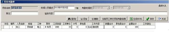 在勞務考勤中,記錄的內(nèi)容主要包括:當前日期的出勤情況、工作內(nèi)容。如下圖所示:員工張三在7月25日,考勤數(shù)為8,工作內(nèi)容為,在A區(qū)接線纜。他的工資類型屬于計時,所以8代表8小時,他當天的工資為:25乘以8=200。除正常的考勤外還有承包款一項,一般是記錄員工當天的補助或加班費等。