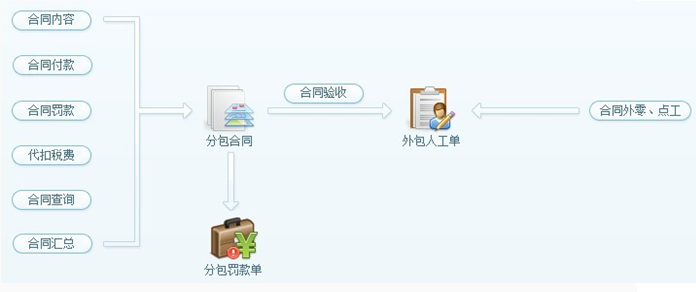 3. 【分包費】可用于統(tǒng)計專業(yè)分包產(chǎn)生的成本及臨時雇用的零工成本。如軟件流程圖所示:分包成本是由外包人工單產(chǎn)成,其來源可分為兩部分,第一:來自分包合同中的合同驗收,第二:來自合同外零、點工驗收。