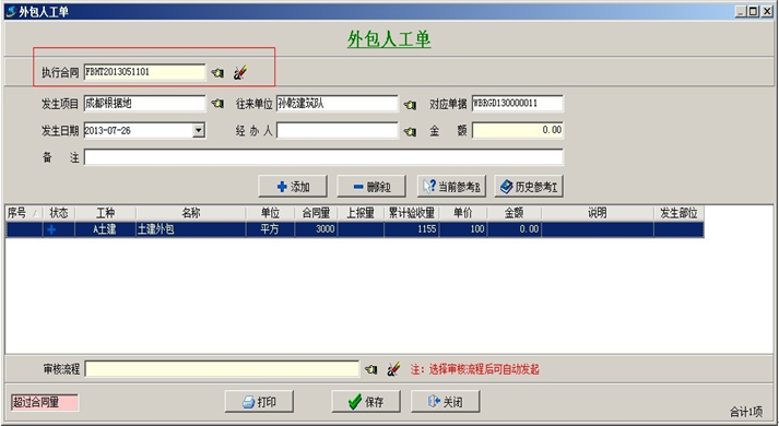 合同驗收和合同外零、點工驗收,都要建立外包人工單,兩者的區(qū)別在于,前者在外包人工單中執(zhí)行的合同(可以讀取到合同內(nèi)的相關(guān)信息,如合同量、上報量等),后者在外包人工單中未執(zhí)行合同。