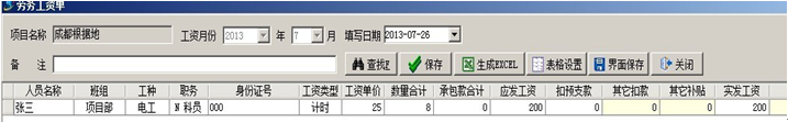 如果勞務工人有預支工資的情況,可以記錄在勞務預支單里,在生成工資表時,系統(tǒng)自動計算扣預支款,另外生成工資表時還有承包款合計以及兩項可以手動添加的款項:其他扣款和其他補貼。