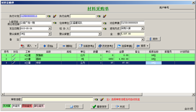 第四步,材料到貨之后,可在【材料管理】模塊,做“材料采購單”,選擇材料的時候,選擇“執行合同”,在合同明細里面添加到貨內容。如圖:
