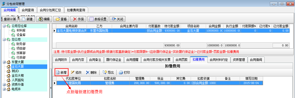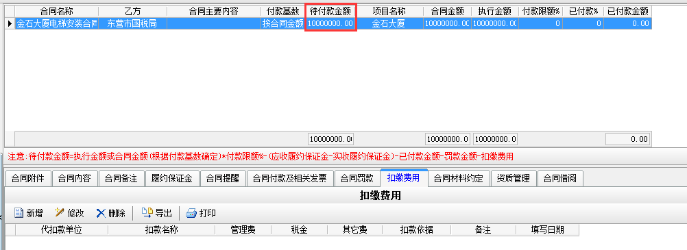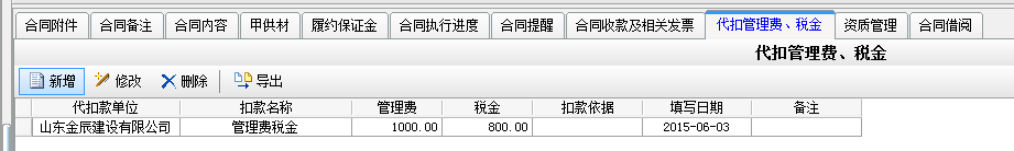 在工程項目資質掛靠管理中乙方B借用乙方A的資質,乙方A需要扣除乙方B管理費,如果需要乙方A代開發票還需要扣除稅金。在分包合同中[扣繳費用]模塊下操作,如下圖:
