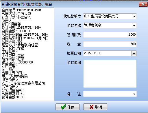在工程項目資質掛靠管理中因為借用乙方B的資質,需要扣除管理費,如果需要乙方B代開發票還需要扣除稅金。在承包合同中[代扣管理費稅金]模塊下操作,如下圖: