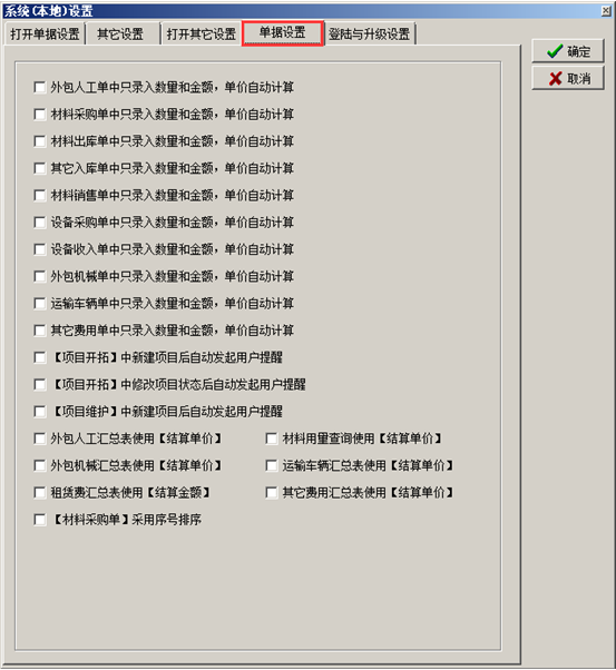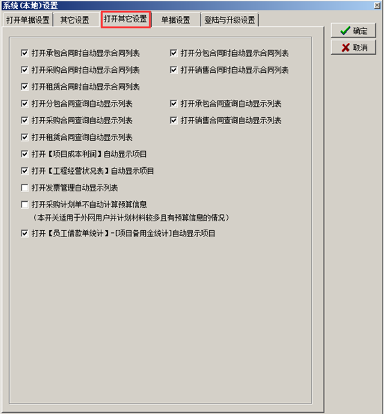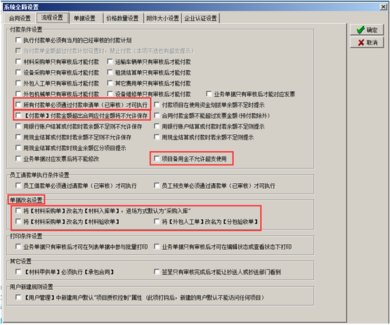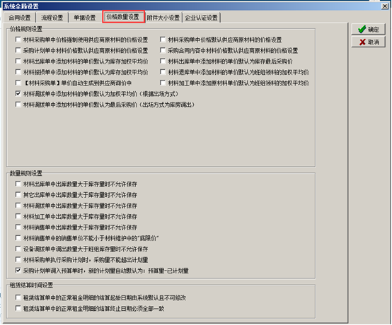 進(jìn)入系統(tǒng)的“系統(tǒng)維護(hù)”-“系統(tǒng)全局設(shè)置”彈出系統(tǒng)全局設(shè)置的對(duì)話框,點(diǎn)擊“合同設(shè)置”,在對(duì)應(yīng)的復(fù)選框打鉤代表合同受對(duì)應(yīng)開關(guān)的控制,如圖: