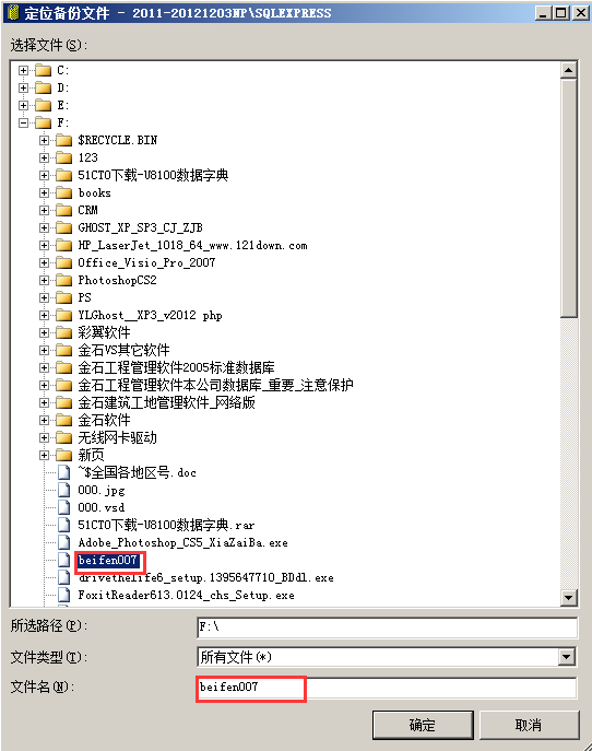 進入“指定備份對話框”,點擊“添加”,進入指定數據庫文件窗口,瀏覽并找到需要還原的數據庫備份文件,點擊“確定”, 點擊“確定”后回到指“定備份”對話框,此時需要還原的文件已經列出來了,接著點擊“確定”,返回“還原數據庫”。如圖: