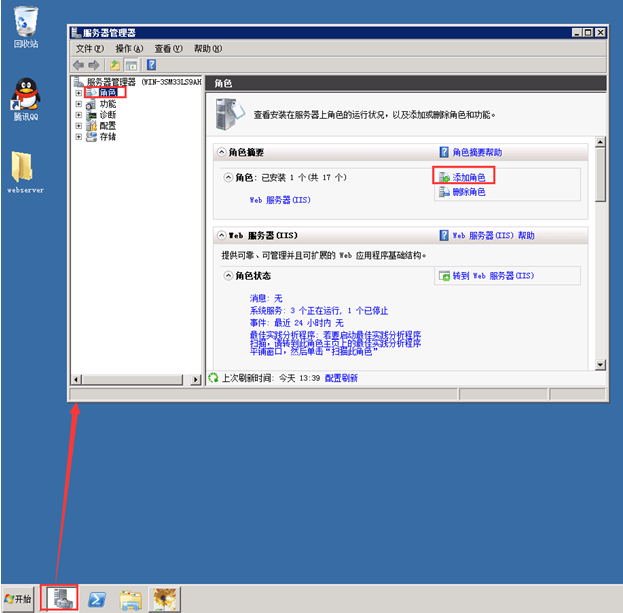 第一步,打開服務(wù)器管理器,在服務(wù)器管理器中添加角色。如圖: