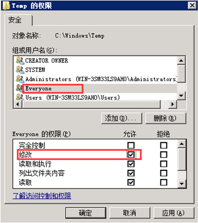 第三步,選中對象“Everyone”,并在權(quán)限中勾選“修改”對應(yīng)的“允許”復(fù)選框。點(diǎn)擊“應(yīng)用”及“確定”按鈕,如圖;