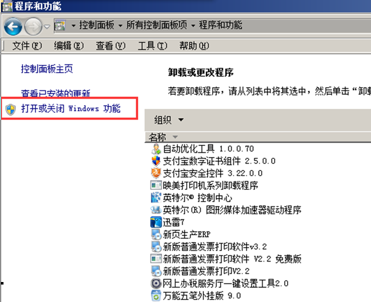 第二步,在“程序和功能”中點(diǎn)擊“打開或關(guān)閉程序”,如圖: