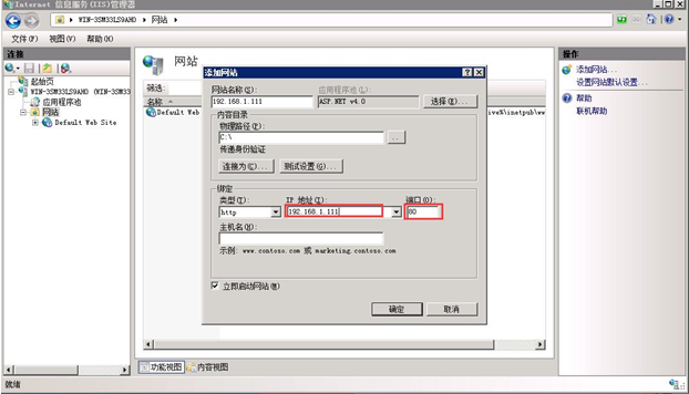 5. 在運(yùn)行狀態(tài)輸入inetmgr,打開IIS管理器 添加網(wǎng)站,并選擇好應(yīng)用程序池為 Asp.net 4.0 及網(wǎng)頁所在主目錄。