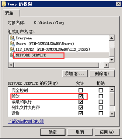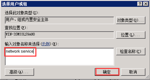 第五步,同樣的方法添加對象名“network service”并開放“修改”權(quán)限。如圖: