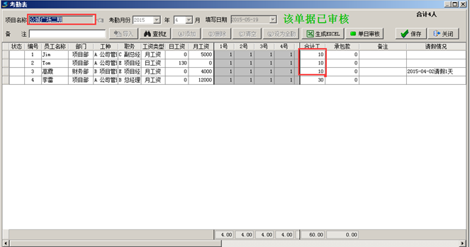 例如,Jim、Tom、高霞都是在同月出勤了兩個項目“眾城廣場一期”和“眾城廣場二期”,則在工程管理軟件中四月份分別做兩給項目的考勤表。如圖: