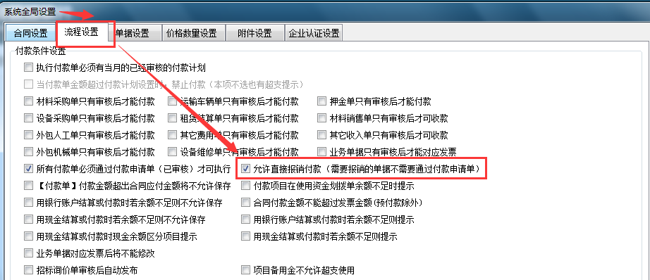 流程設(shè)置→允許直接報(bào)銷付款打鉤(需要報(bào)銷的單據(jù)不需要通過付款申請(qǐng)單)