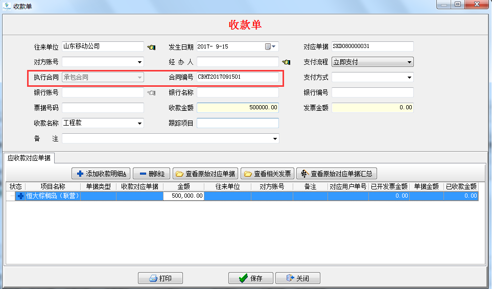 ④“分包合同”→“墊資款記錄”→“執(zhí)行收款”, 【收款單】墊資款收到(此處的往來單位是掛靠我公司資質(zhì)的聯(lián)營單位)