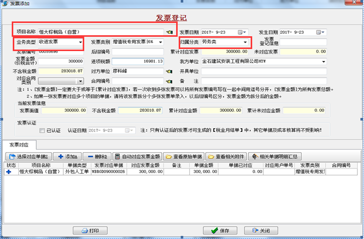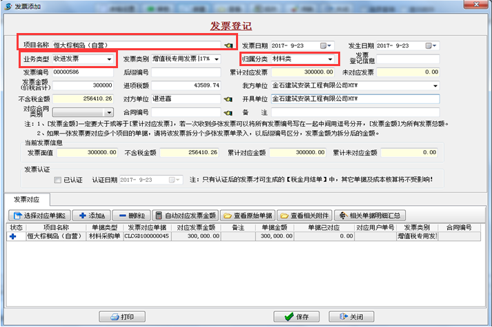 ②進項稅對應(yīng)材料票:菜單欄【財務(wù)管理】→【發(fā)票管理】“收進發(fā)票”歸屬分類選材料票(在一個項目中應(yīng)控制材料票、勞務(wù)票等所占的比例,此功能用于計算掛靠單位發(fā)票歸屬所占百分比)