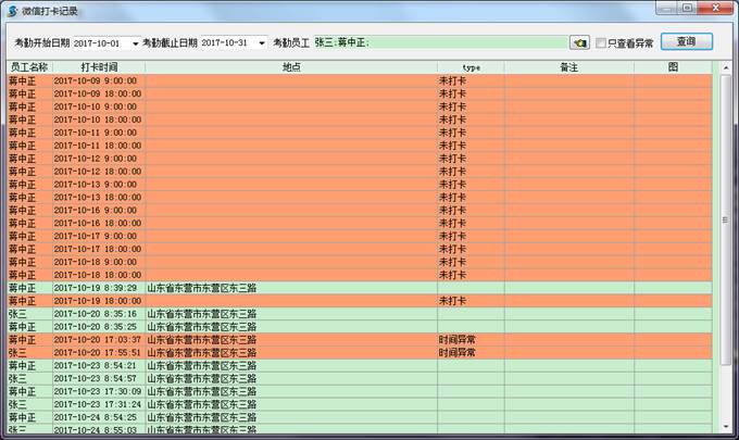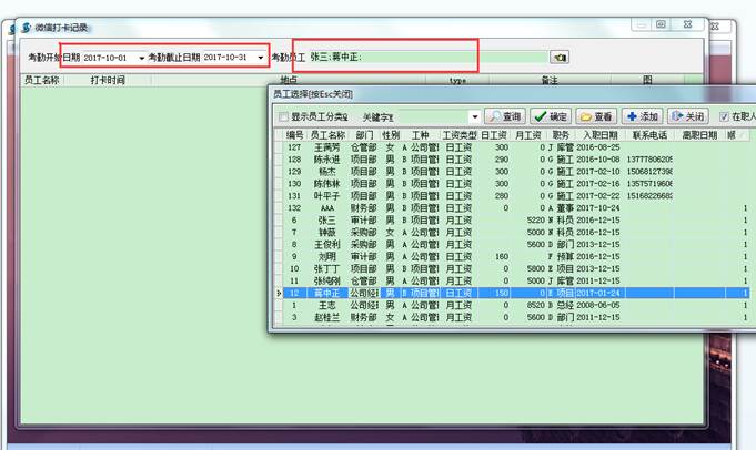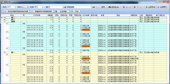 選擇好時間段,和考勤員工后,點(diǎn)擊查詢按鈕,出現(xiàn)如下圖所示