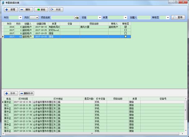 在考勤設(shè)備讀取操作界面也有相應(yīng)的查詢篩選項,可以通過年份、月份、項目名稱、設(shè)備、來源、創(chuàng)建人、審核否等相關(guān)信息來篩選查詢從考勤設(shè)備讀取的信息。