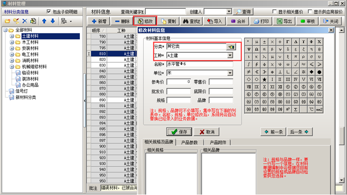 3、維護員到工程管理軟件的材料維護或手機微信中看到未審核材料后可用 【修改】或【合并】的功能來把有錯誤的材料糾正。