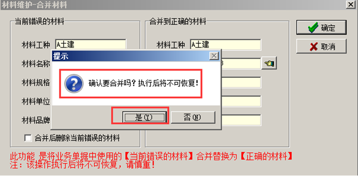 將已經(jīng)存在于工程管理軟件材料庫中的材料進行【合并】,選中錯誤的材料,點擊“合并”,在彈出的“合并材料”的對話框中選擇正確的材料名稱,所選擇的材料名稱必須是系統(tǒng)中已經(jīng)審核通過的材料。如圖所示: