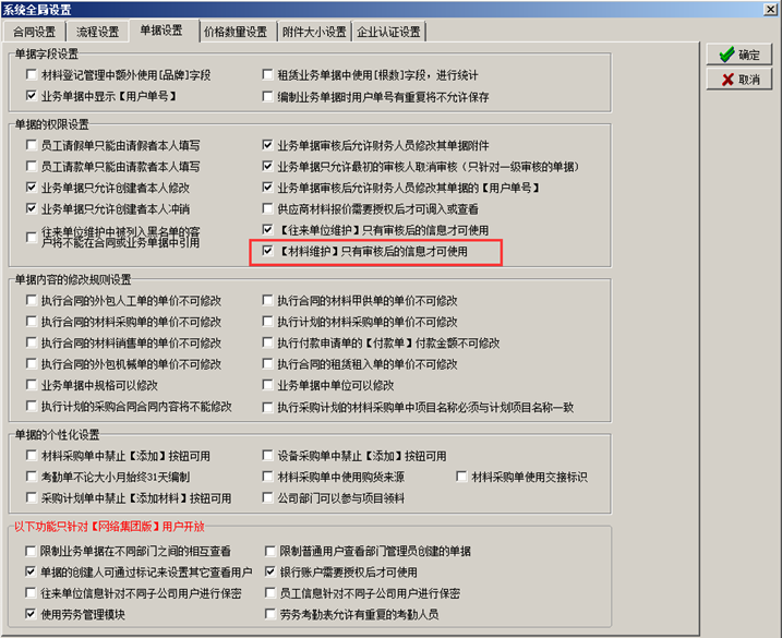 注:如何強制控制新材料使用,可以開啟工程管理軟件的全局開關(guān)【只有審核后的材料才可使用】,此開關(guān)打開之后系統(tǒng)中新添加的材料只有審核通過之后才可以使用,如圖: