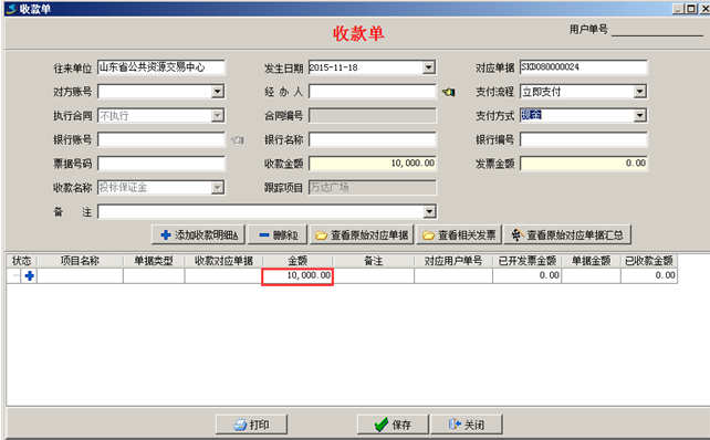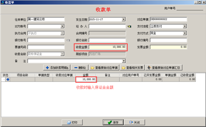 點(diǎn)擊“收到”,填寫(xiě)收款單,輸入好保證金的金額,如圖: