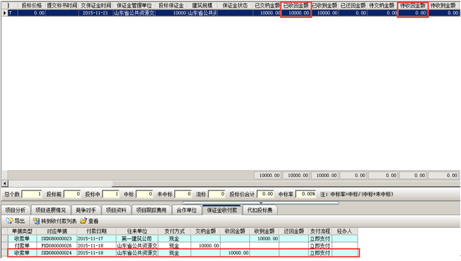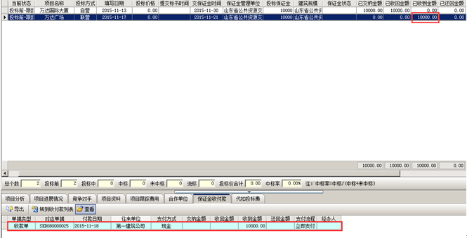 收款完成,工程管理軟件中會(huì)顯示已收到金額以及投標(biāo)保證金的收付款記錄。如圖所示:
