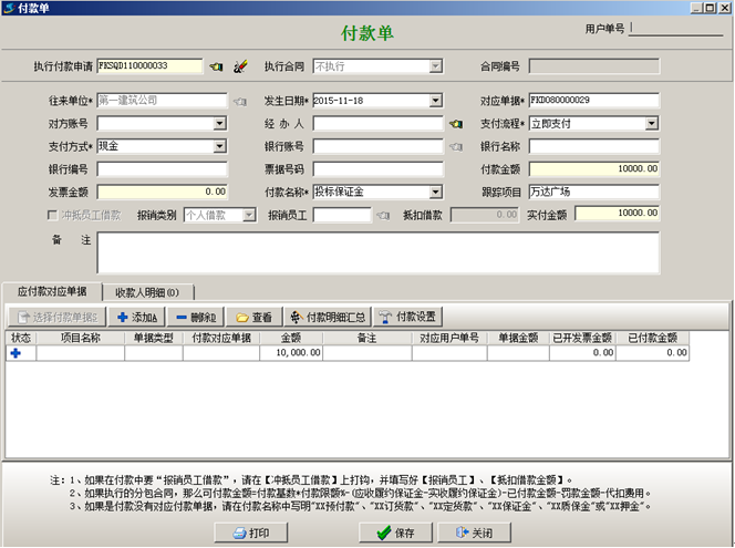 交納投標(biāo)保證金時(shí)填寫(xiě)“付款申請(qǐng)單”或者“付款單”,(如果填寫(xiě)的是付款申請(qǐng)單則在付款申請(qǐng)單審核通過(guò)之后進(jìn)行付款),如圖: