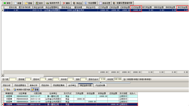 保證金收回,工程管理軟件的項(xiàng)目開(kāi)拓中會(huì)顯示“已收回金額”為收款金額,待收回金額會(huì)減去已收回金額,“保證金”收付款中會(huì)有對(duì)應(yīng)的收款記錄,如圖: