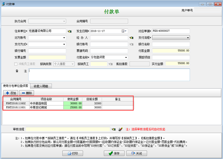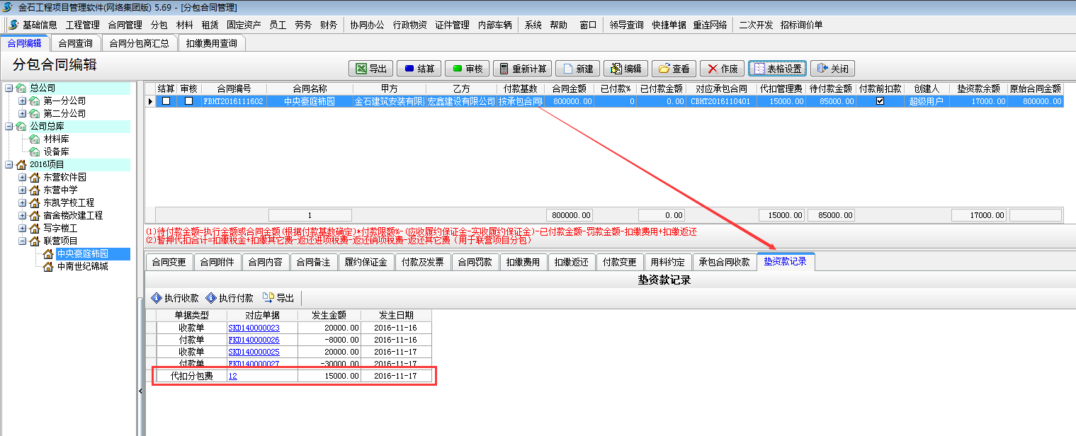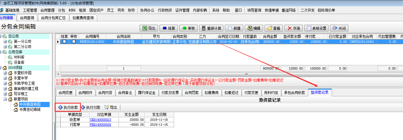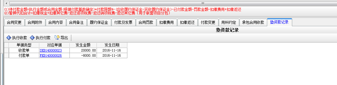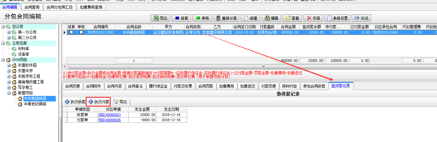 在【分包合同】-【墊資款記錄】處選擇執行付款,或者在【財務管理】-【付款單收款單】新建付款單選擇墊資款付款。