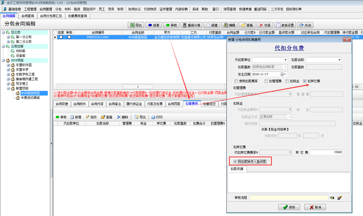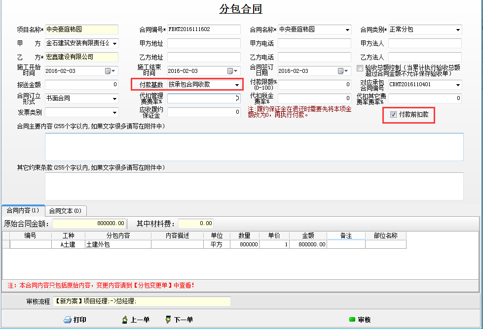 在建立分包合同時可選擇在“付款前扣款”處打鉤,這樣在付款前,必須做扣繳費用才能付款,避免有忘記扣款的情況。具體參見文章“分包合同付款前扣款的使用”index.php?c=msg&id=1529&