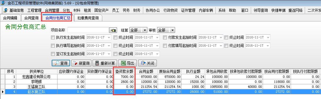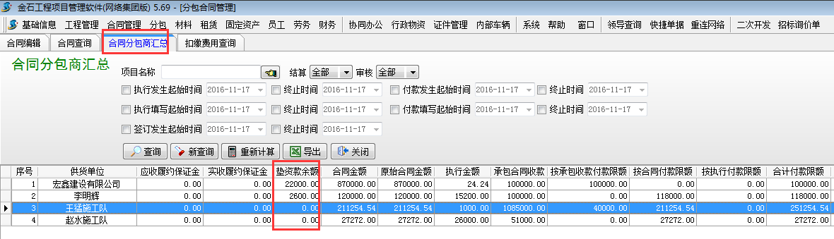3.1 查詢聯營單位所有墊資款余額??梢栽凇痉职贤?【合同分包商匯總】處查詢。