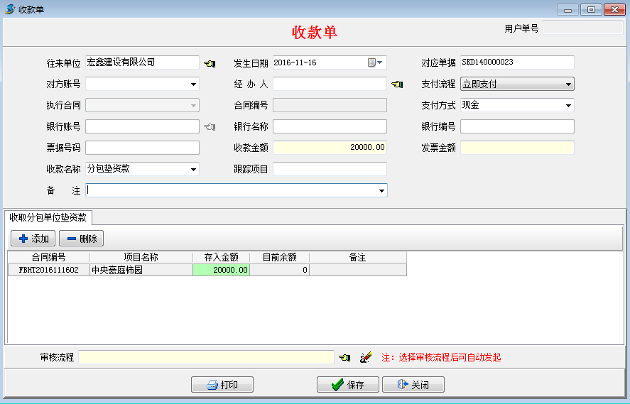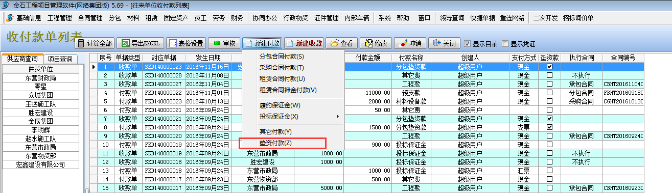 在工程項目管理軟件【分包合同】-【墊支款記錄】處選擇執行收款,或者在【財務管理】-【付款單收款單】新建收款單選擇墊資款收款。