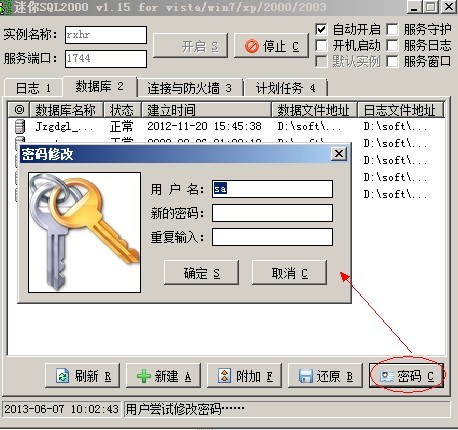 在服務器端,到第二選項卡數據庫中,在右下角有一個修改密碼按鈕,
